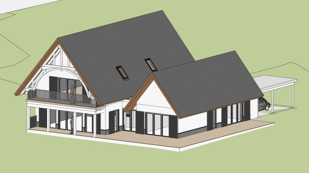 Planung und Einreichung eines Einfamilienhauses in gehobener Ausstattung mit zugehörigem Carport. Der Grundriss wurde unter Berücksichtigung einer flexiblen Nutzung als Haupt-, Neben- oder Ferienobjekt erarbeitet.